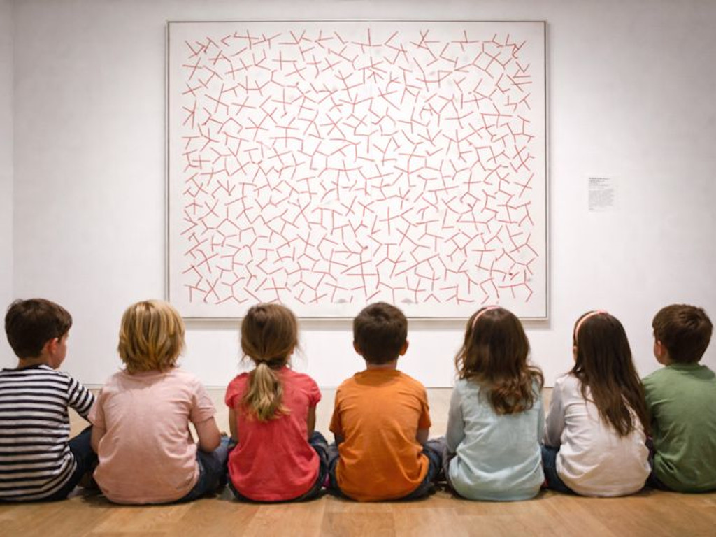 Sin perder de vista la gota del tubito, el grupo dirige también su mirada a la obra ¿Tienen algo en común? La monitora les da la clave: “nos fijamos en una figura individual y en el conjunto. como nuestras gotas, que individualmente son pequeñas e insignificantes pero juntas cobran un sentido y hacen un océano, en el cuadro las líneas también forman figuras y una composición”.